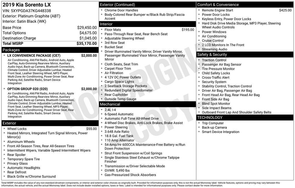 Whether you're looking for a capable family hauler, a versatile adventure companion, or a well-equipped daily driver, this 2019 Kia Sorento LX is sure to impress. With its impressive combination of features, performance, and value, this SUV is an exceptional choice that is priced to sell quickly. Don't miss your chance to experience the Sorento's exceptional blend of style, comfort, and capability – contact us today to schedule a test drive.