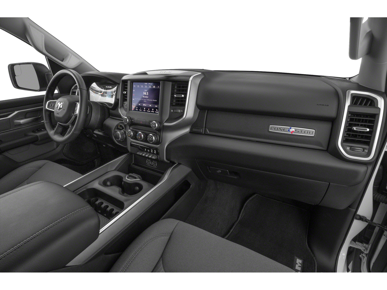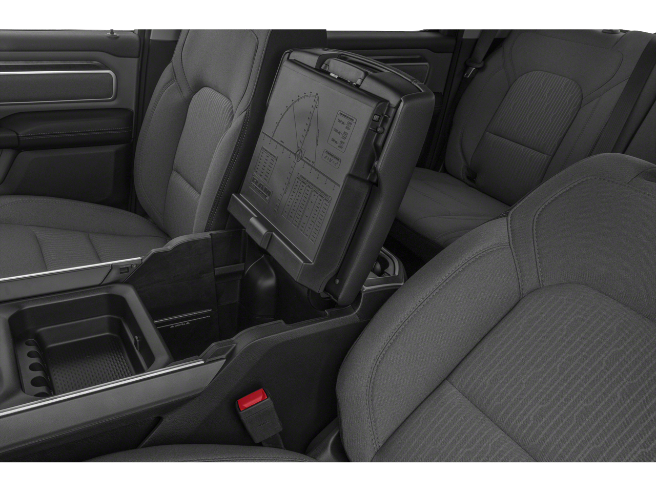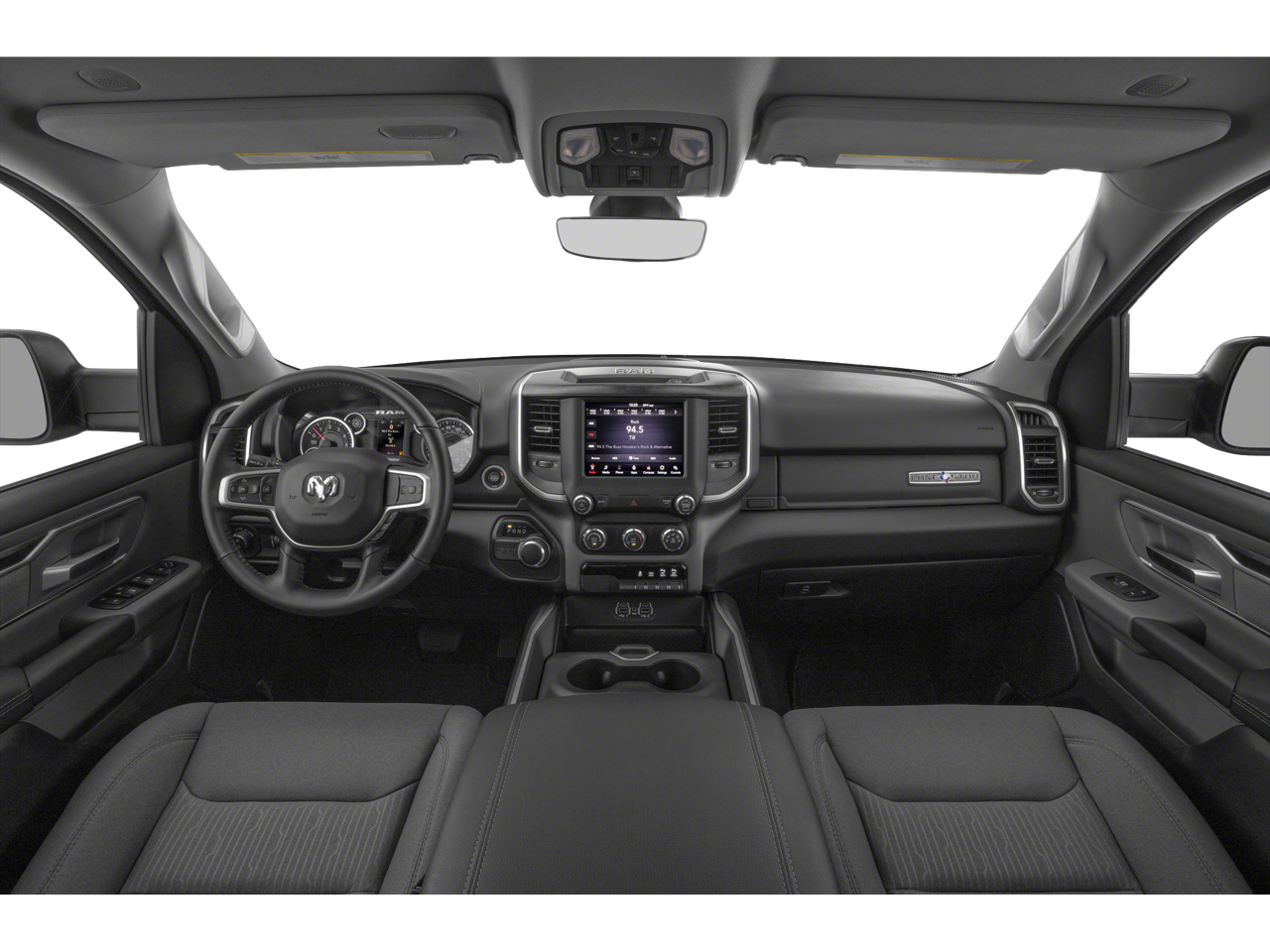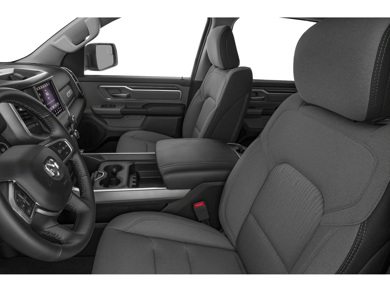 The spacious and well-appointed interior of this Ram 1500 offers the perfect blend of comfort and capability. With seating for up to six, the Deluxe Cloth bucket seats provide exceptional support, while the full-length floor console and 2nd-row in-floor storage bins offer ample storage solutions.