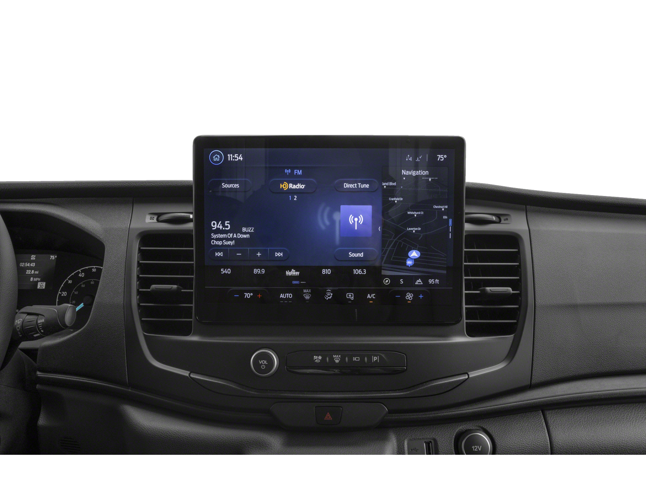 - Radio: AM/FM Stereo w/SYNC 4 -inc: 12" multi-function display, Bluetooth®, dual USB ports, embedded voice recognition, connected navigation w/3 years of service available through Ford Pro Intelligence, 4 speakers (front), Ford commercial solutions energy management and vehicle insight tools (access to the Ford charge network, public charging account setup and management, driver public charging tools, home charging reimbursement, Ford E-Telematics dashboard and connected navigation) included for commercial and business customers complimentary for 1 year